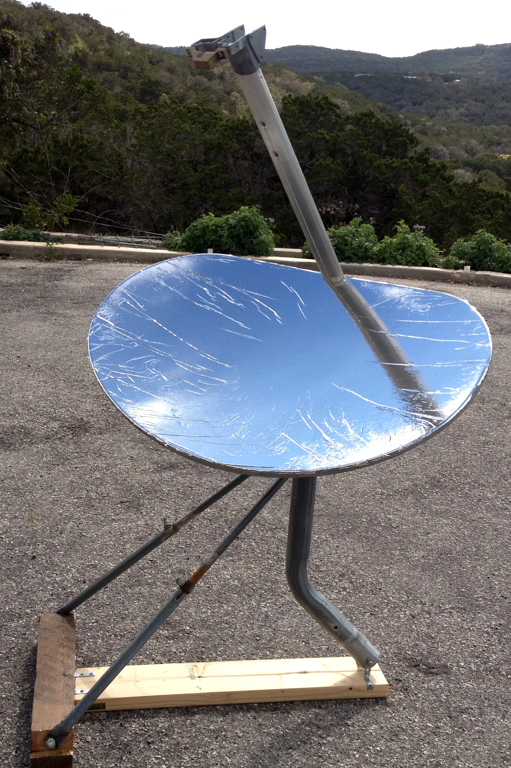 If the surface of your dish isn’t already mirror-like, you will need to polish it, or cover it with a highly-reflective foil. Then, to make it function as a stove, you will need to add a bracket or design a hanging method, to hold your cook pot in place while the stove heats the food or water.